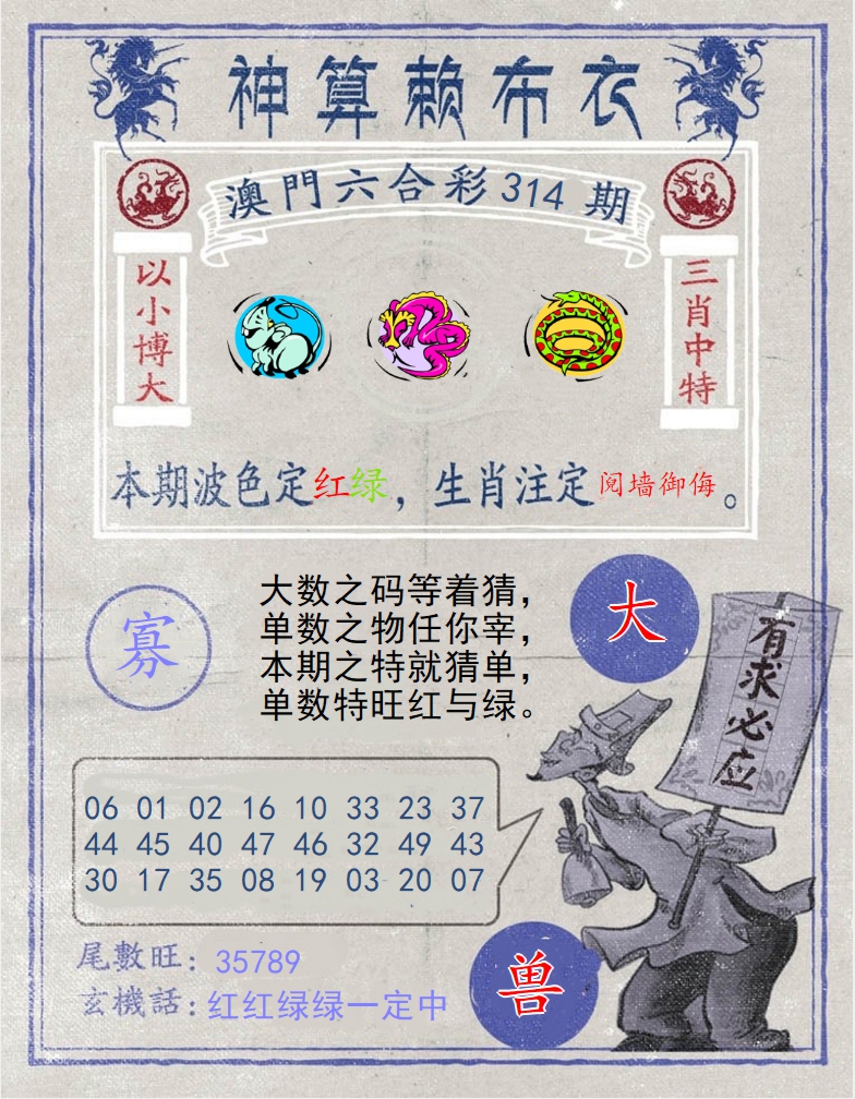 | 314期:大数之码等着猜,单数之物任你宰,本期之特就猜单,单数特旺红与绿 |