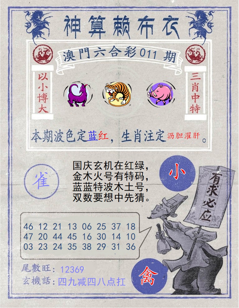 | 011期:国庆玄机在红绿,金木火号有特码,蓝蓝特波木土号,双数要想中先猜 |